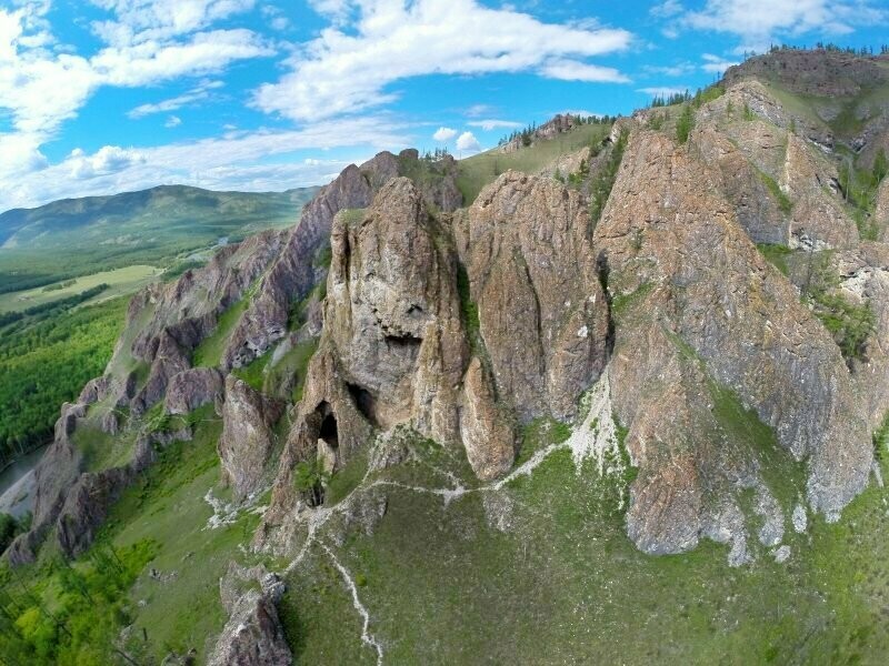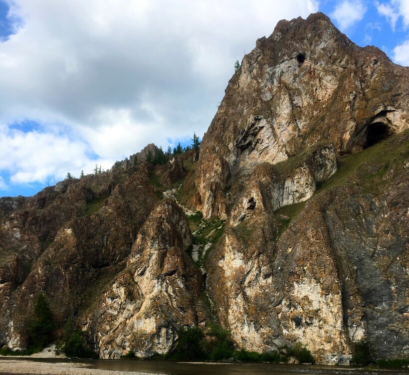 Другое ее название — Тогыз-Аз, и с местного хакасского языка это переводится как «девять ртов». Ртами местные жители как раз называли гроты, некоторые из них служили жилищами древних людей. Если посмотреть на участок с реки или с противоположного берега, то действительно скалы похожи на каких-то неведомых существ с огромными открытыми ртами.