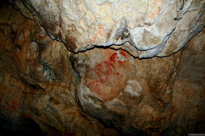 Ну, а самая известная пещера — это грот Проскурякова, названный в честь ученого, который в конце XIX века впервые описал местные пещеры. Грот находится в самом начале тропы, и в нем ученые обнаружили останки вымерших животных, в том числе шерстистого носорога, следы кострища и орудия из камня. Также анализ стен пещеры показал, что она была заселена 46 тысяч лет назад. А еще тут есть рисунки, выполненные охрой: им примерно 4,5 тысячи лет.