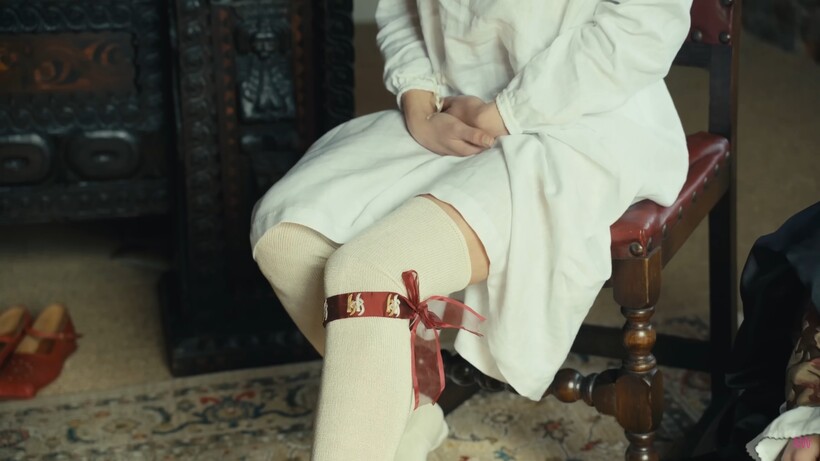 Наряд начинался с льняной нательной рубашки, шелковых чулок ручной вязки и подвязок, на которых золотыми и серебряными нитями были вышиты инициалы королевы. На этом же этапе делалась прическа: длинные волосы заплетались в косу и прятались под льняной чепец. Кстати, королевское нательное белье делалось из тончайшего голландского льна, что выгодно отличало его от простых рубашек.