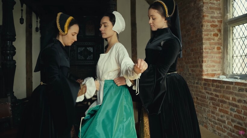 Чтобы прикрыть обман, поверх надевали еще одно платье из малинового бархата с жесткой планкой и большими рукавами, нередко обшитыми мехом. Платье также зашнуровывали, планку крепили золотыми булавками, надевали фальшивые рукава. Они не только поддерживали «легенду» дорогого платья, но и сохраняли мех от протирания. Образ дополнялся украшениями, такими как пояс, ожерелье и кольца — они были самой дорогой частью наряда. Финальный штрих — это французский капюшон. Так называли широкую бархатную накладку на голову на жесткой основе, украшенную вышивкой и дополненной черной атласной вуалью.