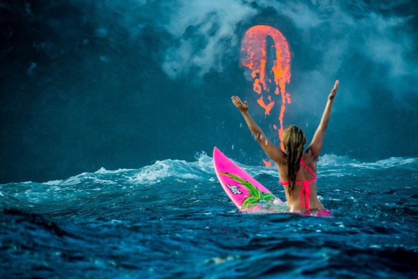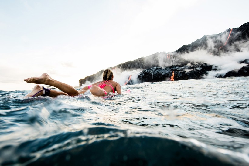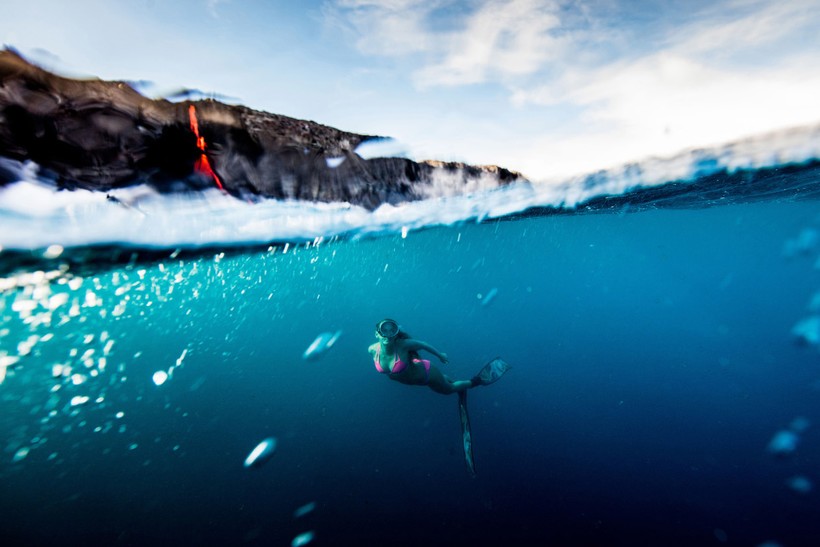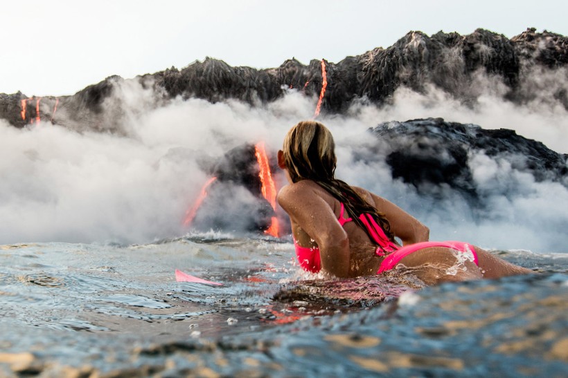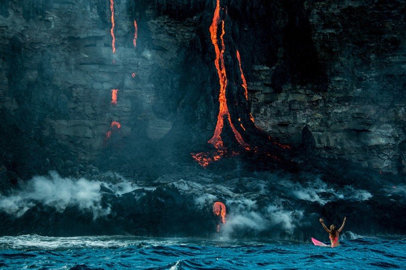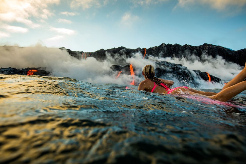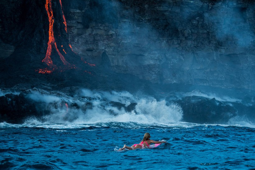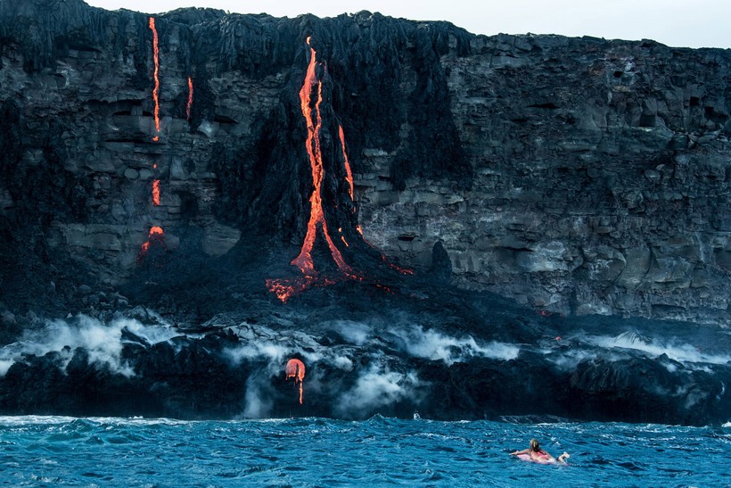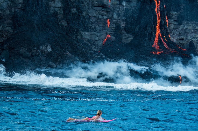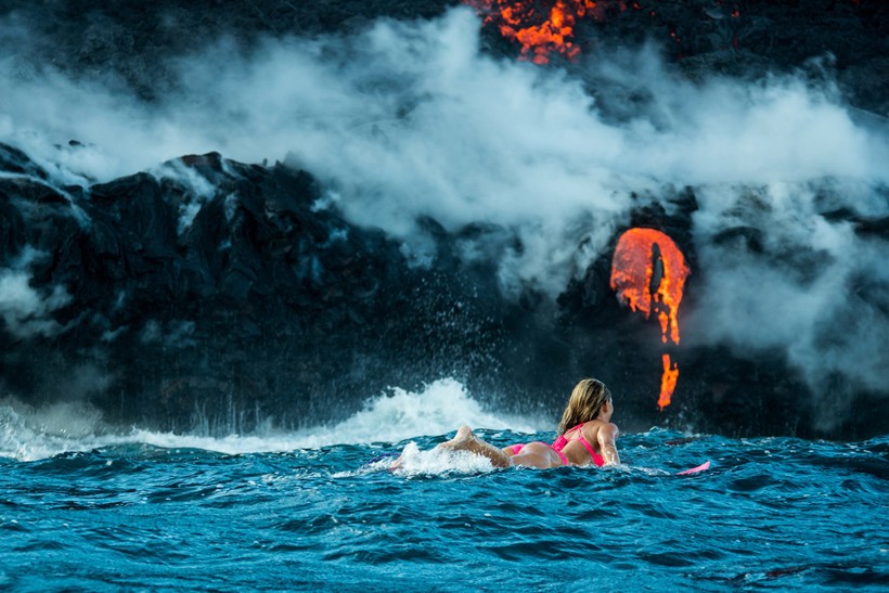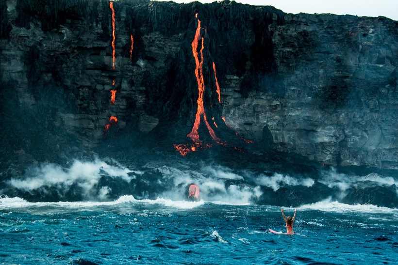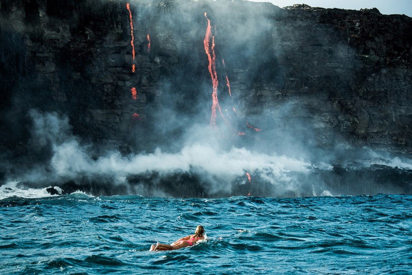 Бурлящие потоки лавы стекают прямо в океан, в то самое место, где и решила поплавать спортсменка