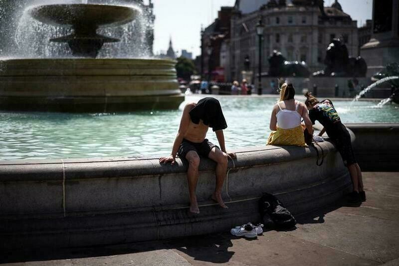 Люди пытаются спастись от жары у фонтана на Трафальгарской площади