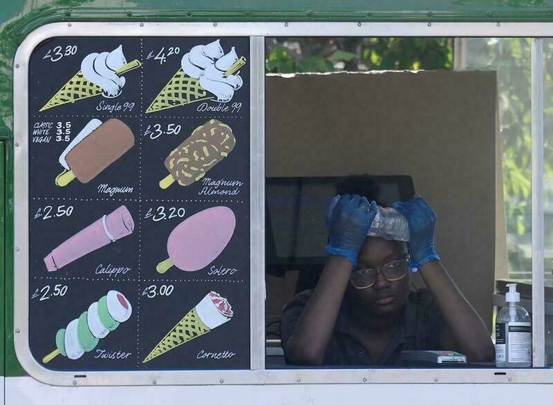 Продавец мороженого прикладывает к голове бутылку с водой, чтобы легче перенести жару