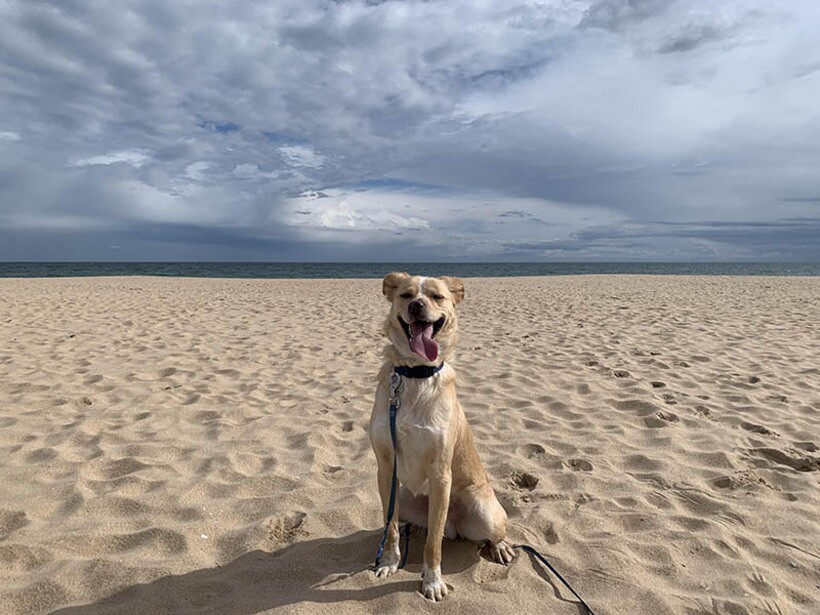 Пес сделал такую довольную морду, что без слов понятно, как он счастлив оказаться на пляже
