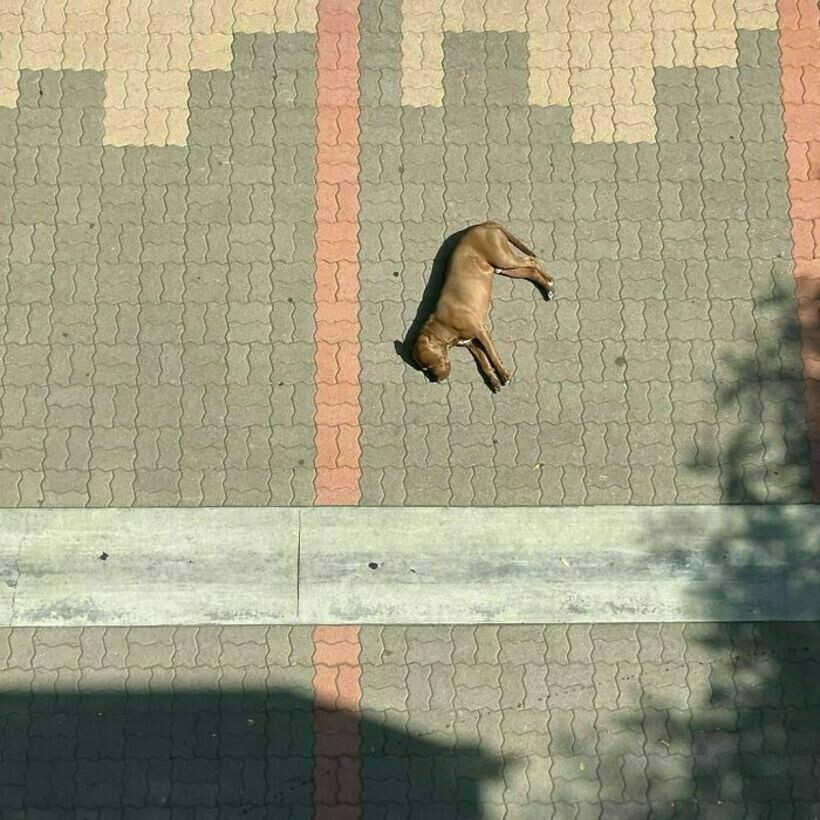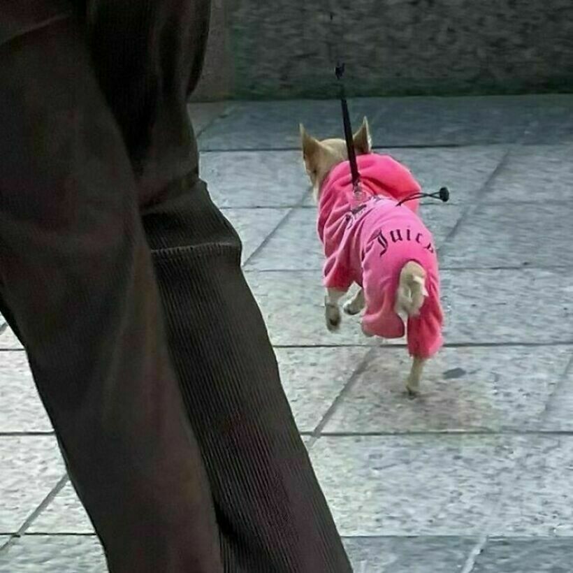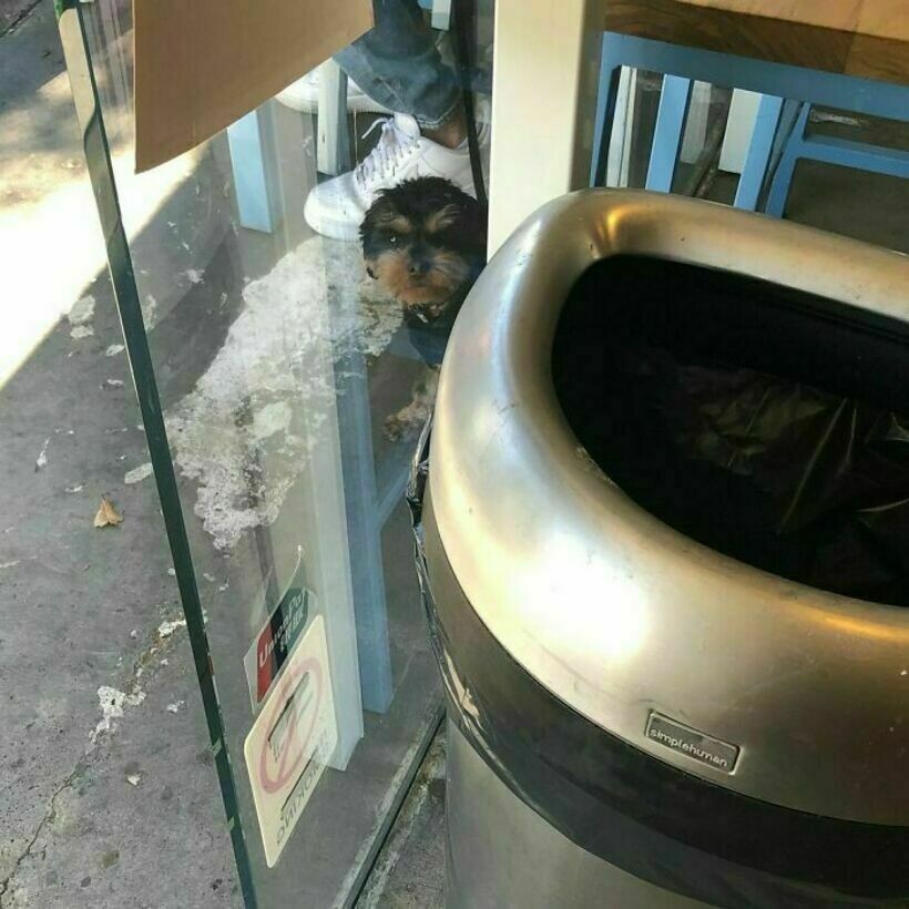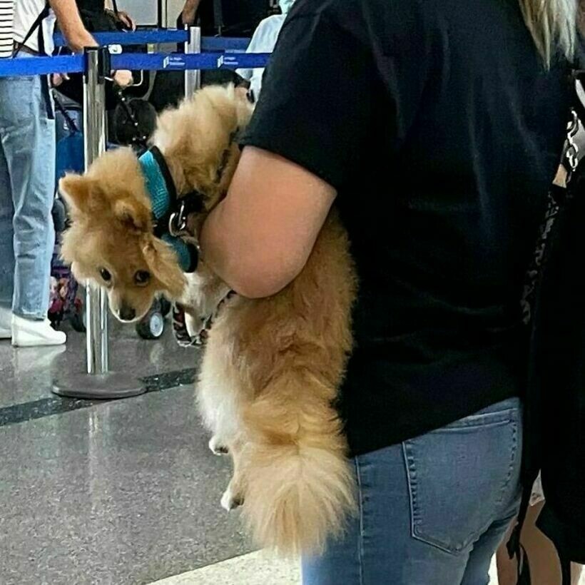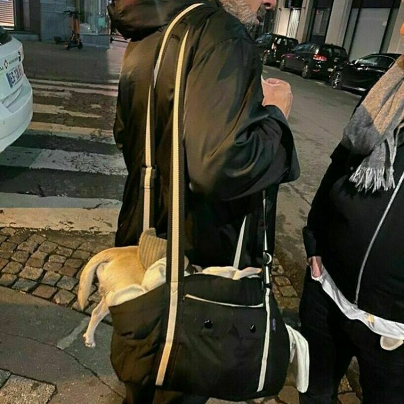 Эта сумка с перевернутыми вещами и торчащей из нее собакой выглядит так, будто ее собирали впопыхах, закидывая все подряд
