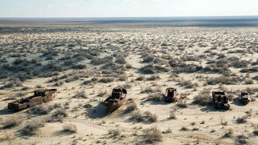 Старые корабли на высохшем дне Аральского моря, Казахстан