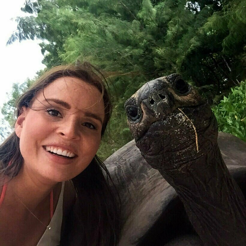 Большая черепаха сама подошла к этой девушке, когда та отдыхала на пляже, и была не против сделать селфи