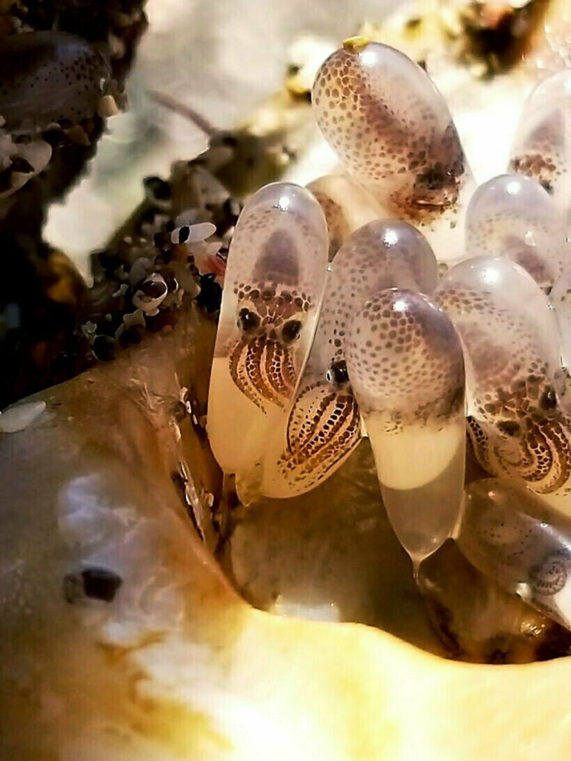 Найденная морская раковина с яйцами кальмара внутри