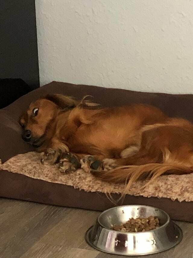 Пес очень сладко спал, и вдруг ему поднесли миску с кормом. Он приоткрыл один глаз и продолжил сомневаться, реальна миска или же она плод его сонной фантазии.