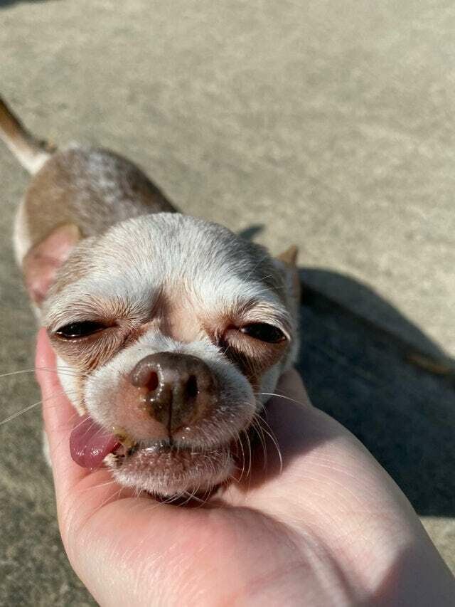 После длительной прогулки пес положил мордашку на ладонь хозяина и всем своим видом продемонстрировал, насколько он устал.