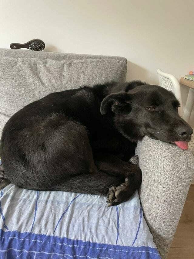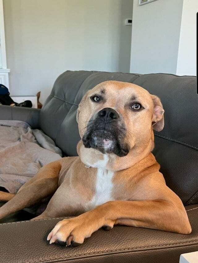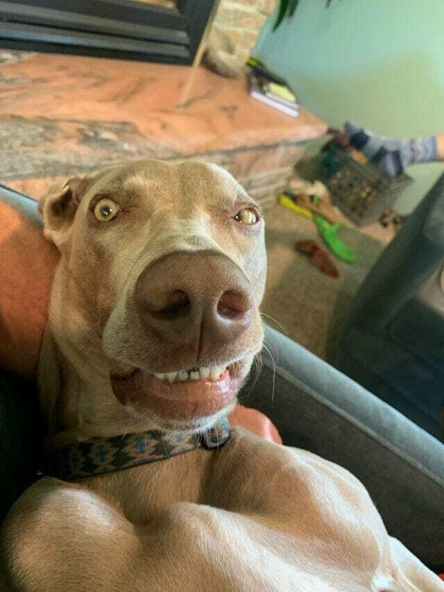 Эта собака так уверенно сидит на диване, что у нее хочется спросить разрешения, прежде чем садиться рядом.
