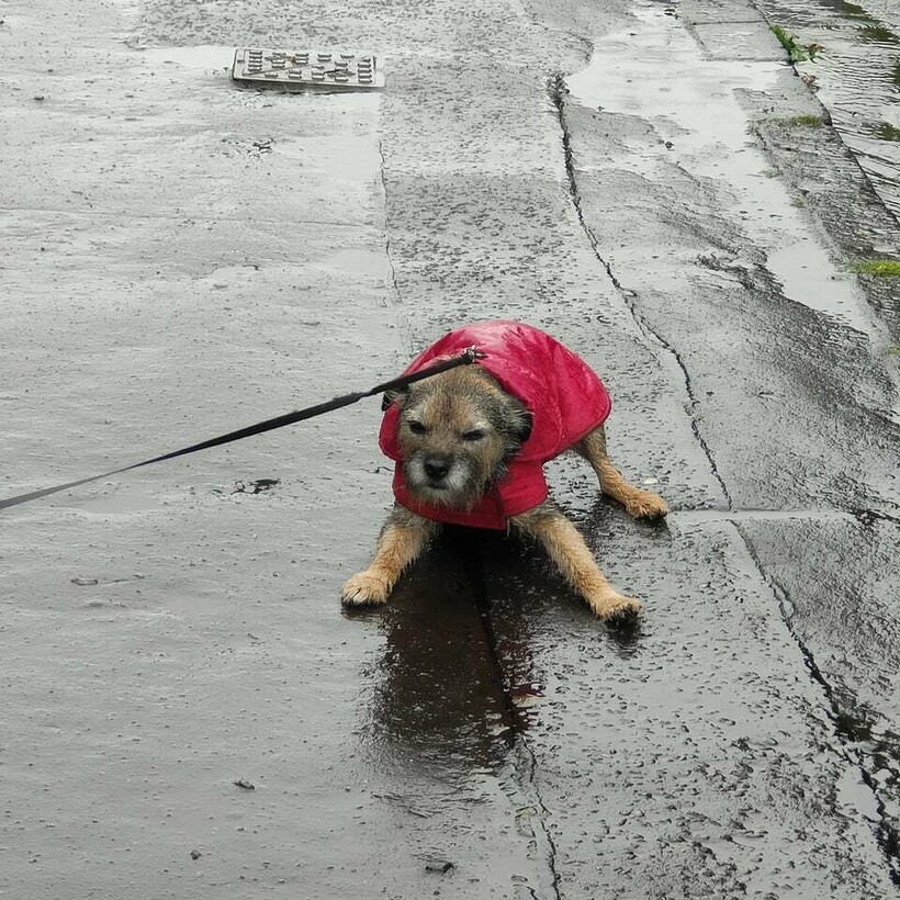 Несмотря на то, что на собаку надели жилет, она осталась такой же недовольной, как и в момент, когда дождь только начинался.