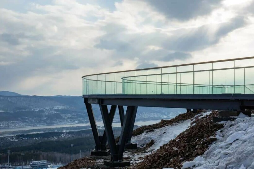 Площадка представляет собой пространство нескольких уровней. В самом низу установили «парящие» мосты, а также зоны для пешеходов. На втором уровне оборудован амфитеатр, где предусмотрены специальные навесы, чтобы укрыть посетителей от дождя. На самом верху установлено несколько скамеек, с которых можно наблюдать окрестности. Взору открывается территория экопарка, Енисей, городские красоты и тайга. С площадки есть удобные выходы на пешие тропы. Ради прекрасной панорамы сюда приезжают туристы со всей страны.
