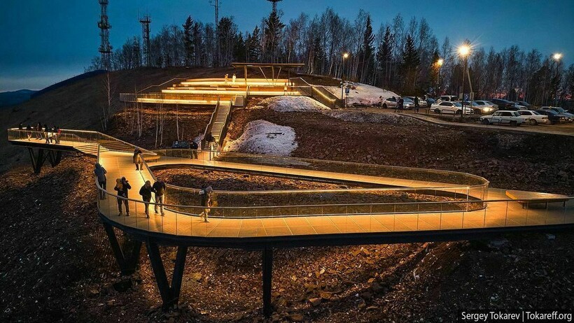 Сама площадка в основном сделана из металлических и деревянных элементов. Благодаря первому авторам проекта удалось создать строгий вид конструкций, а второе обеспечивает некое единение с природой. В то же время массивная площадка выглядит легкой — все дело в стеклянных ограждениях. Они добавляют конструкции воздуха, раскрывают угол обзора и не мешают созерцанию красоты. По всей территории площадки вечером включается подсветка, а на территории города зажигаются уличные огни. В это время панорама просто очаровывает посетителей.