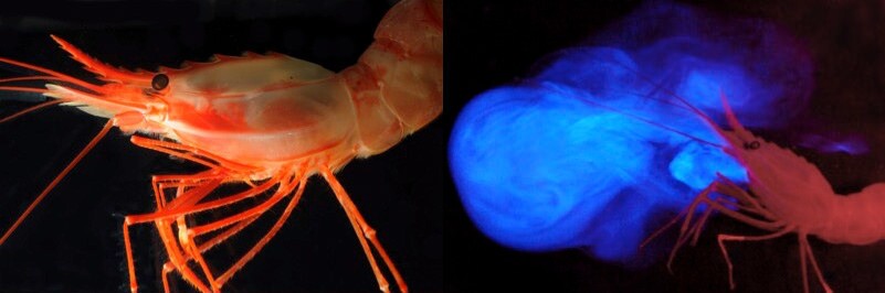 Еще один супергерой нашей подборки — это креветка Heterocarpus ensifer. Сама по себе она не светится, но стоит ей «испугаться», а точнее почувствовать врага, и она выбрасывает светящееся облачко. Оно выполняет отвлекающую функцию: пока враг пытается сообразить, что перед ним, креветка может быстро ретироваться и скрыться из виду.