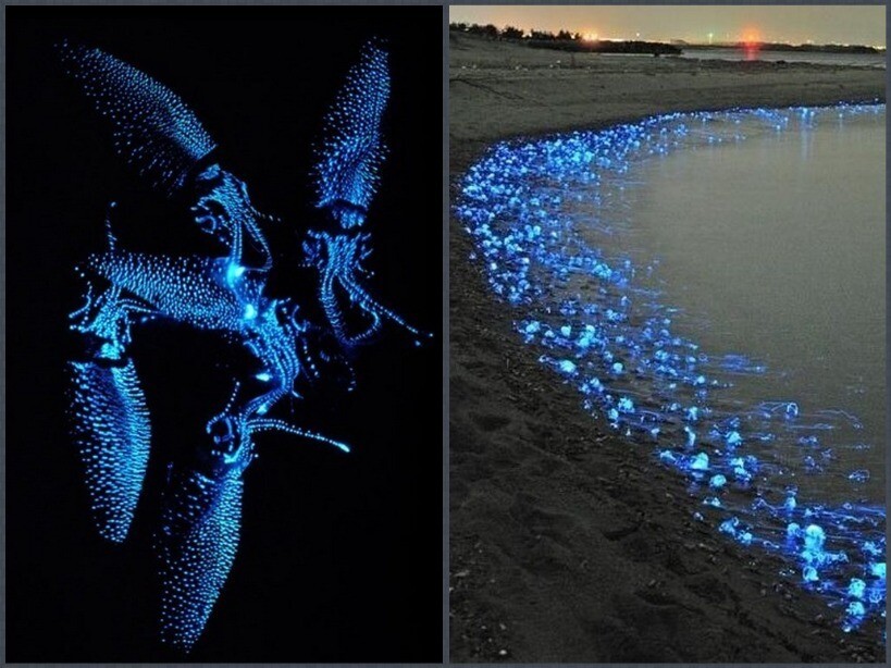 Многие виды кальмаров умеют светиться, но самые интересные живут у берегов Японии, их так и называют кальмары-светлячки. Вообще они являются глубоководными существами, однако во время нереста эти моллюски приплывают к побережью, а японские рыбаки этим активно пользуются.