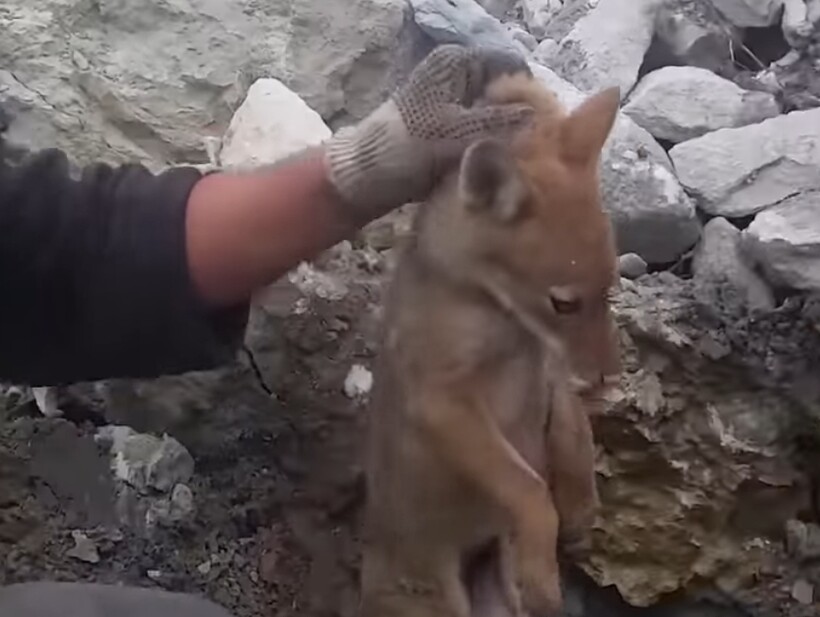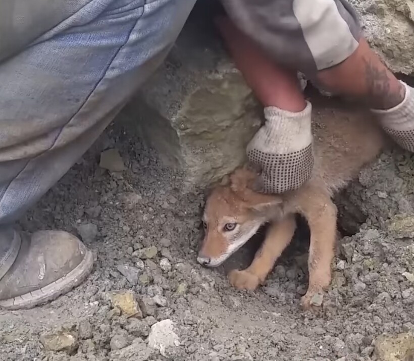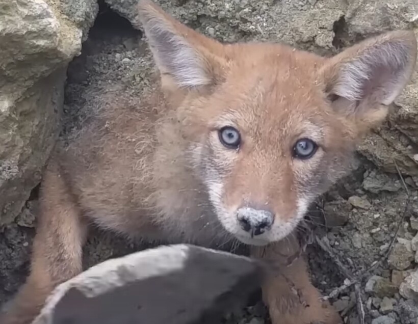 Стоило одному из строителей копнуть рядом с ней, как оттуда выбежали 4-5 щенков и разбежались кто куда. Стены норы обрушились в тот момент, когда последний зверек старался догнать собратьев, и в результате его зажало. Маленький койот не мог выбраться сам, и строители, глядя на жалостливые голубые глазки, решили помочь новому приятелю.