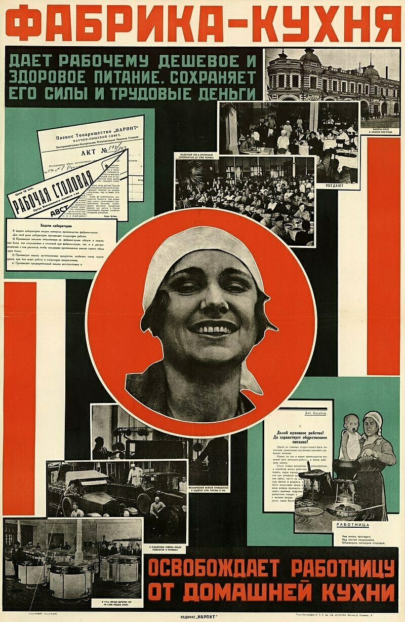 С индустриализацией, которую запустили в стране, требовалось много рабочей силы, в том числе и женской. Так что фактически фабрики-кухни значительно упростили женщинам быт, освободив их от многих домашних хлопот, связанных с приготовлением еды. Была и косвенная цель: организация обеспечивала досуг вне дома, который бы помог уменьшить увлечение рабочих алкоголем. Именно поэтому фабрики-кухни включали в себя не только столовые, куда приходили на обед, но и универмаги, библиотеки и прочие заведения. Ну и конечно, обедом тут подача еды не ограничивалась: здесь можно было питаться утром и вечером, также были столовые для школьников.