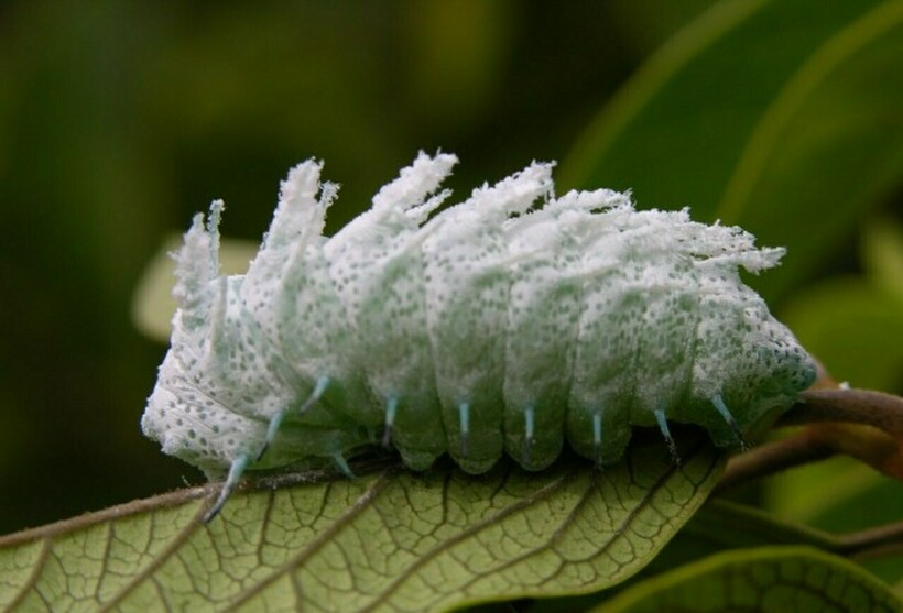 Ну а дальше цикл повторяется: из яиц через пару недель вылупляется гусеница с чрезмерным аппетитом. Она постоянно и много ест, питаясь листьями цитрусовых, корицы, гуавы и многих других деревьев. Такой голод легко объясним: ей нужно запастись энергией, чтобы бабочка смогла прожить как можно дольше.