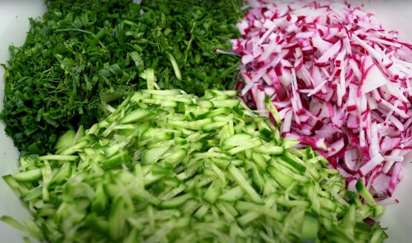 Все начинается с похода на огород, где можно собрать свежие огурчики, редиску и зелень: побольше лука и кинзы, чуть поменьше укропа и петрушки. В некоторых рецептах добавляют литья салата и сельдерея, чтобы блюдо получилось еще ароматнее. Овощи и зелень промываются, а затем мелко шинкуются. Дальше начинается самое интересное: заправка.