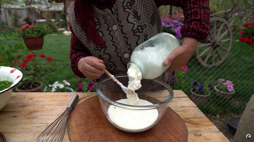 Для этого заранее делается йогурт из молока. При желании йогурт легко заменить любым кисломолочным аналогом, от кефира до ряженки. Смешав вместе все ингредиенты, овдух разливают по мискам, а остатки убирают в банку и ставят в холодное место. Чтобы блюдо было не только освежающим, но и сытным, отдельно к нему подается вареный картофель, яйца, а в некоторых регионах Азербайджана еще и мясо.