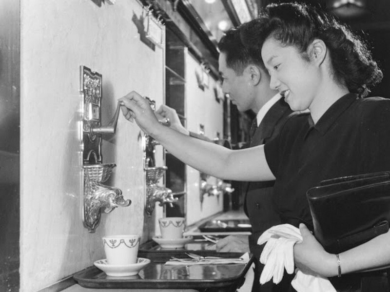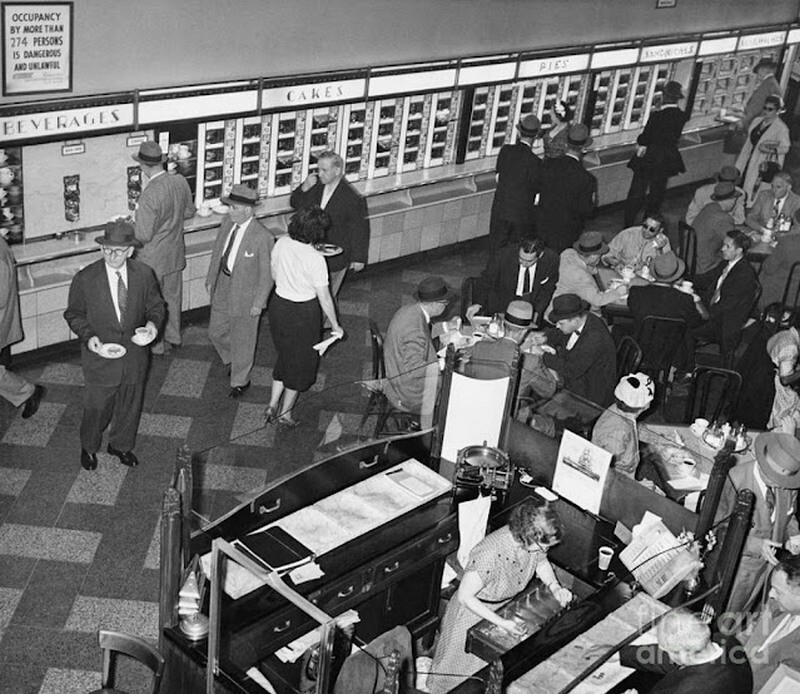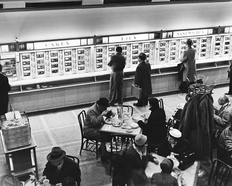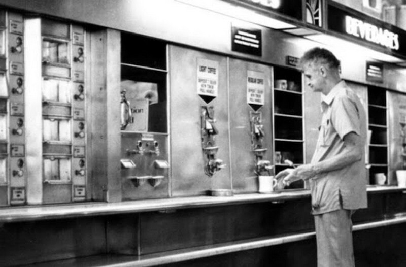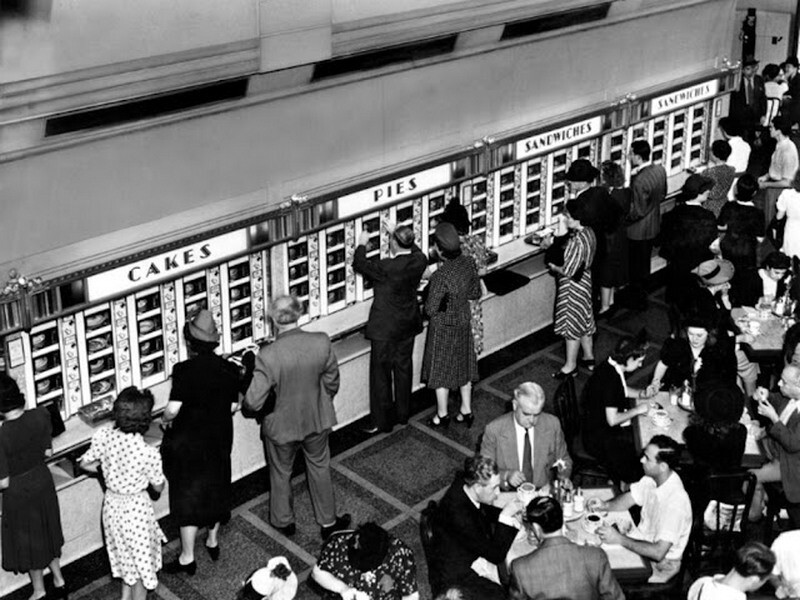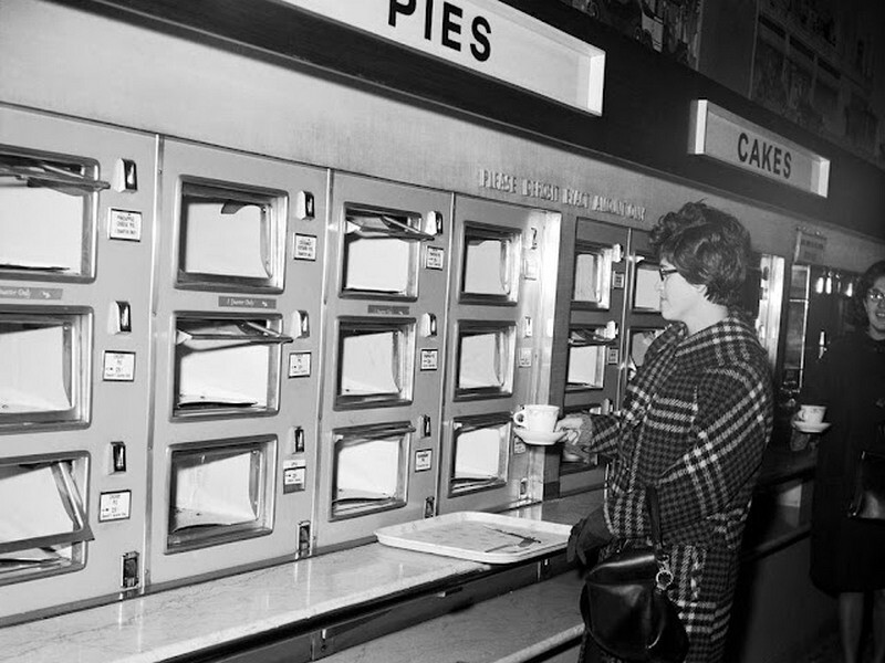 Сегодня, пожалуй, только в Японии и еще в нескольких странах много торговых автоматов, в которых продается еда. Но несколько десятилетий назад они были весьма популярны, особенно в Соединенных Штатах. Это были вендинговые автоматы по продаже не только напитков, но и готовых блюд. Первый, кстати, появился в Берлине еще в конце XIX века, и в стране до сих пор популярны подобные устройства: вот тут мы показывали, что можно купить в торговых автоматах Германии. Но именно в США начался бум, и автоматы превратились здесь в настоящие рестораны. В итоге они стали своеобразным промежуточным звеном между кафе и обычным торговым автоматом. Все, что требовалось от покупателя, — опустить нужное количество монет в отверстие рядом с желаемым блюдом, а затем потянуть за рычаг и получить свой заказ.