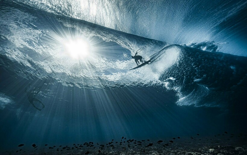 Фил запечатлел совершенно иную историю океана, далекую от мира животных и рыб: он снял, как любитель катания на досках покоряет огромные волны.