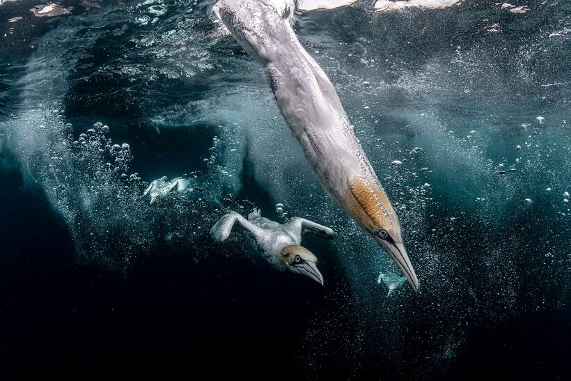 Второе место взял шотландец: он специально погружался в воду там, где охотятся олуши, чтобы сделать эффектный кадр этих птиц.