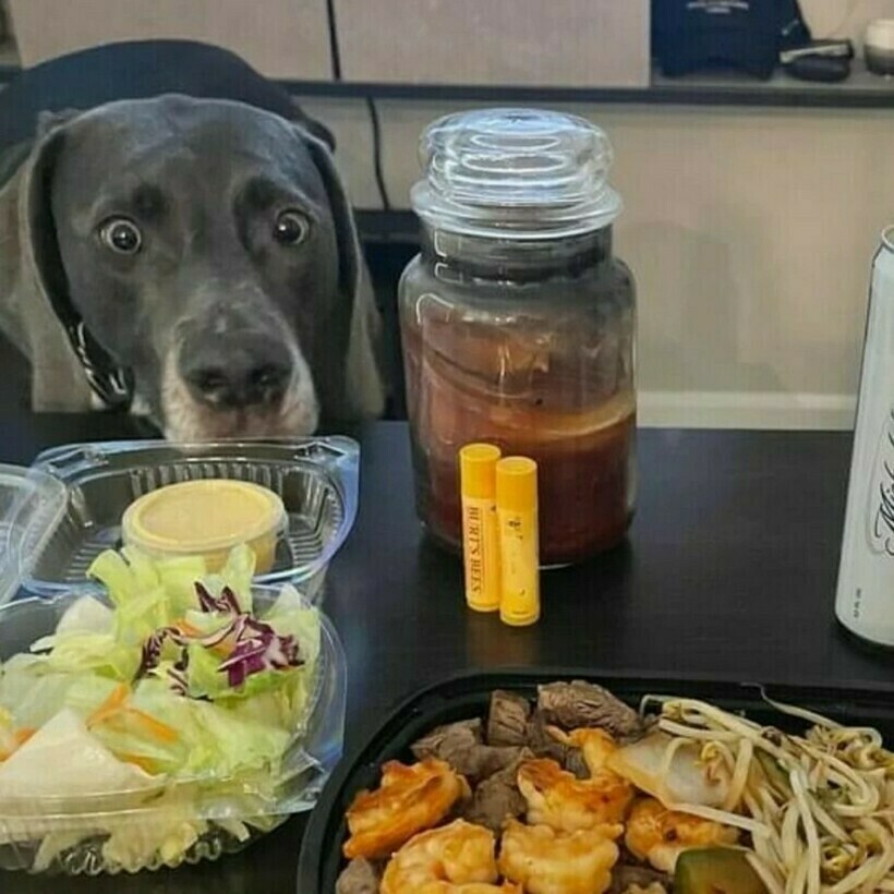 По его безумному взгляду сразу понятно, что он очень хочет кусочек мяса или креветку