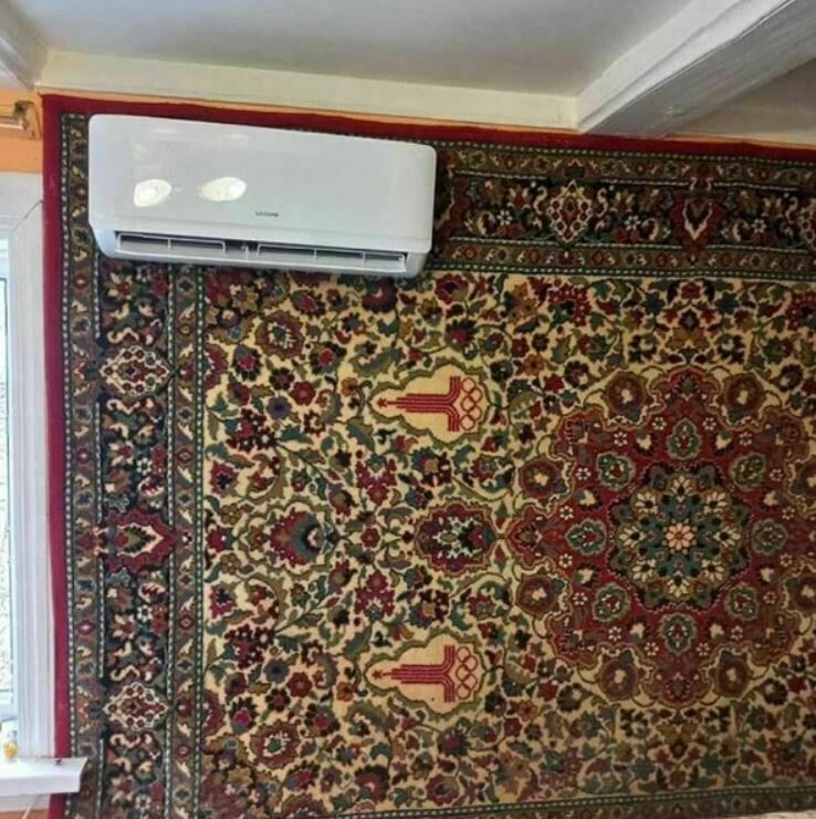 Этот ковер на стене так хорошо вписывается в интерьер, что его решили не снимать, а повесить кондиционер прямо сверху.