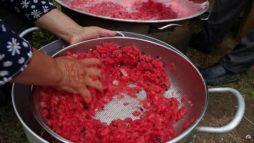 Самое сложное в приготовлении арбузного сока — это носить огромные плоды, мыть их и резать. Также нужна большая посуда, куда поместятся все нарезанные куски. Азербайджанская бабушка и ее супруг демонстрируют, как быстро резать и чистить арбузы и как быстро измельчить их, словно в блендере: тут пригождается строительная дрель и насадка-миксер, которую обычно используют для замешивания цемента. Благодаря мощному инструменту, насадка измельчает арбузы очень быстро, и наступает пора выжать из них сок.