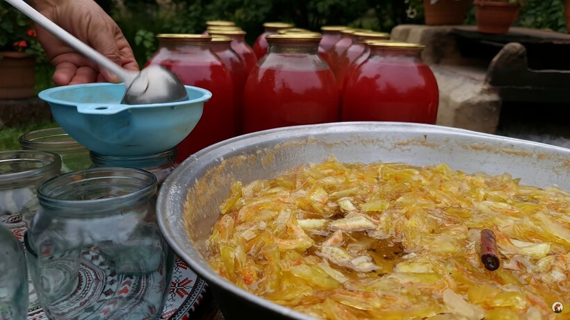 Женщина берет еще одну большую кастрюлю, дуршлаг и протирает арбузную мякоть. Весь сок стекает вниз, а в дуршлаге остается мякоть и семена. После наступает самое интересное: сок надо сварить с сахаром, как обычный компот, а после закатать в банки. При этом важно не забыть добавить немного лимонной кислоты, которая не позволит соку испортиться, а заодно простерилизовать банки и крышки в кипятке с содой. Чистая тара — залог хорошей консервации.