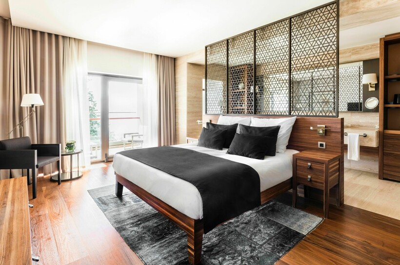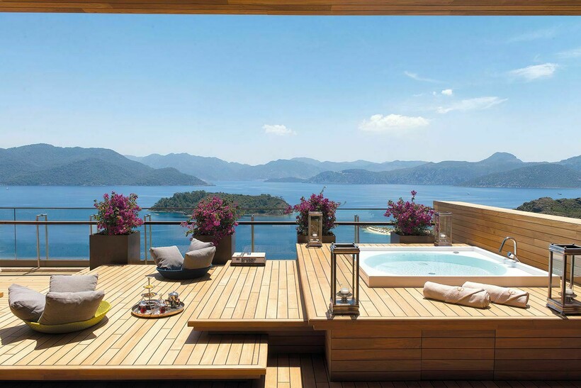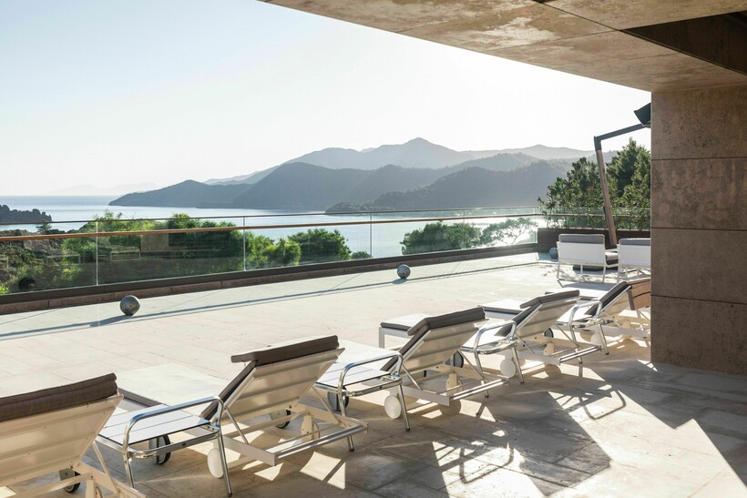 С террасы президентского дуплекса открываются панорамные виды на бухту. У виллы, пристроенной к основному корпусу отеля, есть сад площадью 454 м2, бассейн, а также полноценная турецкая баня. Виллу с двумя спальнями и президентский дуплекс обслуживают батлеры.