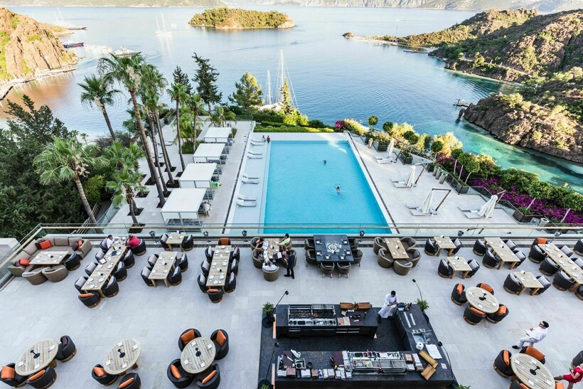 Один из лучших курортных отелей мира, символ «другой Турции», D Maris Bay расположен в уединенной бухте на полуострове Датча недалеко от города Мармарис, там, где волны Эгейского моря соединяются со Средиземным. Отель, территория которого занимает 165 000 м2, находится в заповеднике, на холме, окруженном сосновым и эвкалиптовым лесом, пышными садами и заливом с пятью пляжами.