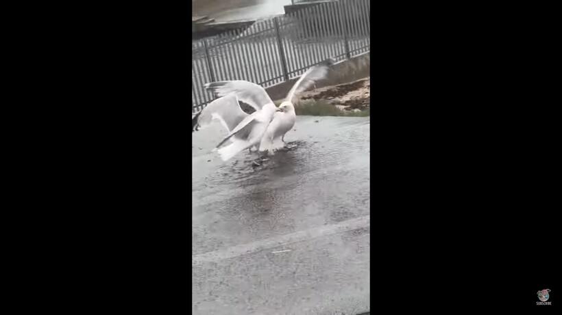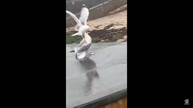 Поняв, что соперник не готов уступить, чайки начали драться. Они прыгали и активно дергали угощение в свою сторону, чтобы вырвать его из клюва другой птицы. Они перемещались по всей крыше, и их борьба становилась все активнее. Уже обе чайки расправили крылья, наверное, с целью показаться больше и напугать этим соперника, но это не работает. Птицы серьезно настроены на борьбу!