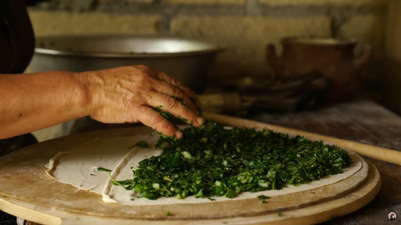 Кутабы могут быть разного вида: без начинки или с наполнением. Без начинки лепешки готовят плотными, раскатывая тесто в 3-4 мм. При этом лепешки смазывают водой с йогуртом. Сложнее с кутабами, в которые кладут начинку. Они должны быть толщиной не более 1 мм. В качестве наполнения можно использовать сыр, мясо, любую зелень, тыкву. Бабушка в сюжете показывает, как готовить кутабы с зеленью и репчатым луком.