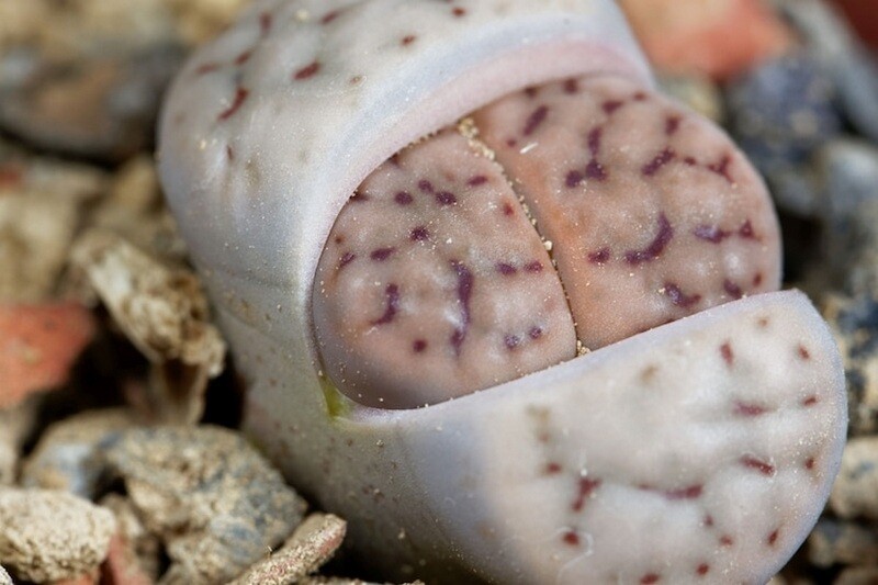 Но самое интересное, что у литопсов невероятные цвета: от светло-серого до темно-красного, иногда насыщенного зеленого. Бывают литопсы полосатые, пестрые и даже в цветную крапинку: узоры просто невероятные, прямо как у самых настоящих камней. Все это позволяет им легко сливаться с галькой, среди которой могут расти эти суккуленты. Кстати, африканцы так и называют эти растения — «живые камни», а с греческого «литопс» переводится как «каменное лицо» или «каменная внешность».