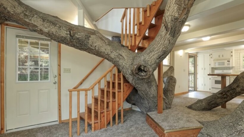 В центре участка росло дерево. На тот момент дерево было совсем не большим, но срубить его у семьи не поднялась рука. Они решили построить дом прямо вокруг дерева, и им это удалось. Сначала дерево занимало только гостиную, а потом распространилось и на верхний этаж. За долгие годы дерево стало неотъемлемой частью декора дома и его визитной карточкой.