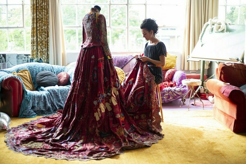 Когда путешествие платья подошло к концу, его сшили воедино, превратив в настоящее произведение искусства. Изящный лиф на пуговицах, длинные рукава, пышная юбка и эффектный шлейф: этот шедевр создан и 84 кусочков ткани, руки к которым приложили мастера из разных уголков планеты.