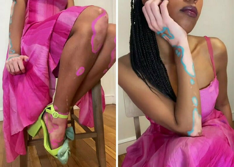 Витилиго — это аутоиммунное заболевание кожи, и проявляется оно в том, что клетки перестают вырабатывать меланин, отчего на теле появляются белые пятна. Кожа теряет пигмент, эти пятна могут разрастаться. Природа болезни до конца не изучена, и неизвестно, что именно вызывает витилиго. Людям с витилиго больше чем другим нужно беречься от солнца и рекомендуется не загорать (кстати, о самых главных заблуждениях в отношении загара мы рассказывали вот тут). Когда Амара узнала о своей болезни, она замкнулась и перестала общаться с друзьями и близкими, боясь, что те ее не смогут понять.