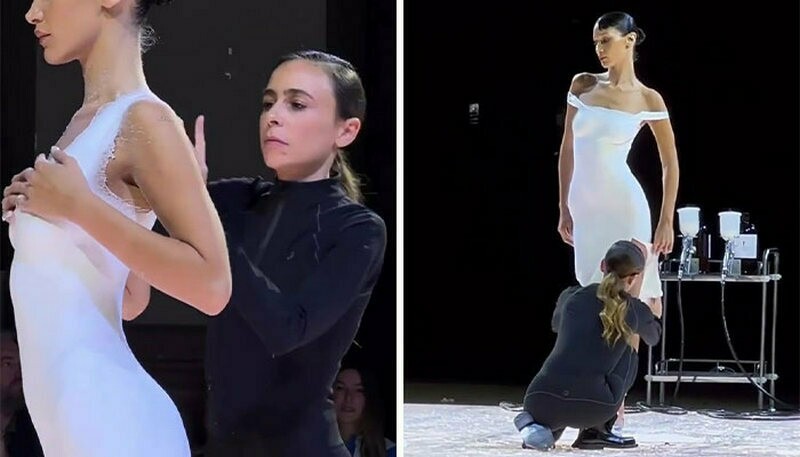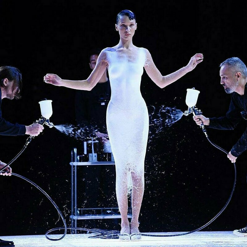 Необычный наряд стал кульминацией показа французского бренда Coperni. Его дизайнеры любят работать с инновационными материалами, они вдохновляются миром технологий и науки. Поэтому для создания «жидкого» платья они объединились с компанией Fabrican Ltd, которая и разработала необычный состав. В баллончике, из которого нанесли необычное вещество на Беллу Хадид (именно она стоит на подиуме), была распыляемая ткань. У нее просто невероятный состав: после высыхания ткань становится пригодной для носки. Жидкость в распылителе содержала волокна синтетики и хлопка, но дизайнеры уверяют, что в составе может быть любой другой тип волокон: шерсть, нейлон, целлюлоза. У этой разработки большие перспективы, ведь из баллончика можно создать не только платья, но и другие вещи: например, медицинские бинты.