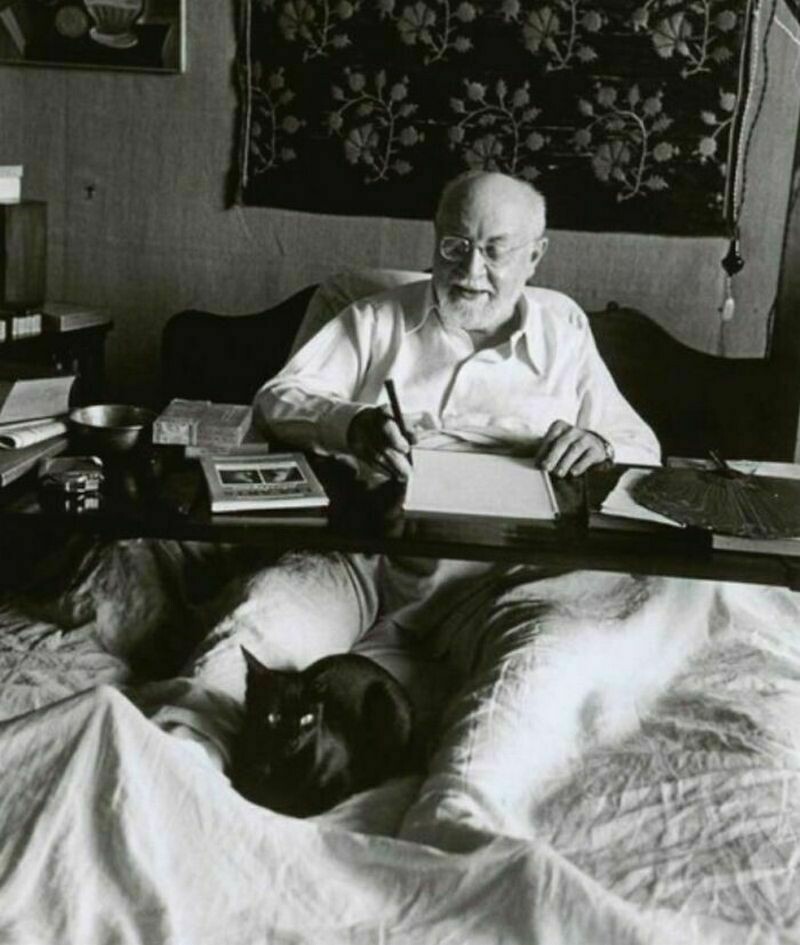 Французский художник Анри Матисс за работой в компании кошки, 1949