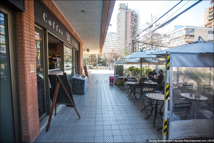 Так как дома чилийцы не готовят, почти в каждом доме есть кафе, небольшой ресторанчик, кофейня или закусочная.