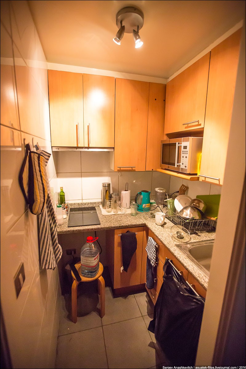 Еще более крохотная кухня. Теперь понимаете, почему у них нет дома стиралок и никто даже не подумает ее здесь установить.