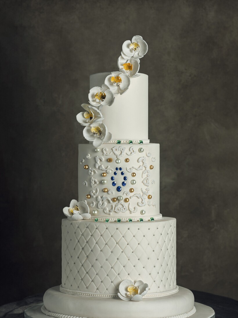Торт, созданный кондитером курорта Венсаном Стопеном, представляет собой трехъярусное белоснежное чудо. В будущем торты станут изготавливать в точном соответствии с пожеланиями клиента, а этот впечатляющий дебют — классический ванильный бисквит, покрытый глазурной драпировкой: изготовление его заняло 10 часов, было использовано 10 кг ингредиентов. Торт венчает букет сахарных орхидей с тщательно проработанными деталями. Венсан и собственный ювелир отеля The St. Regis Bali Грант Смит работали над проектом совместно, чтобы создать максимально эстетически привлекательный гастрономический шедевр. Торт украшен девятью изумрудами и девятью сапфирами, а также россыпью бриллиантов и жемчуга.