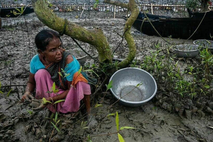 Жительница Индии во время посадки саженцев мангровых деревьев