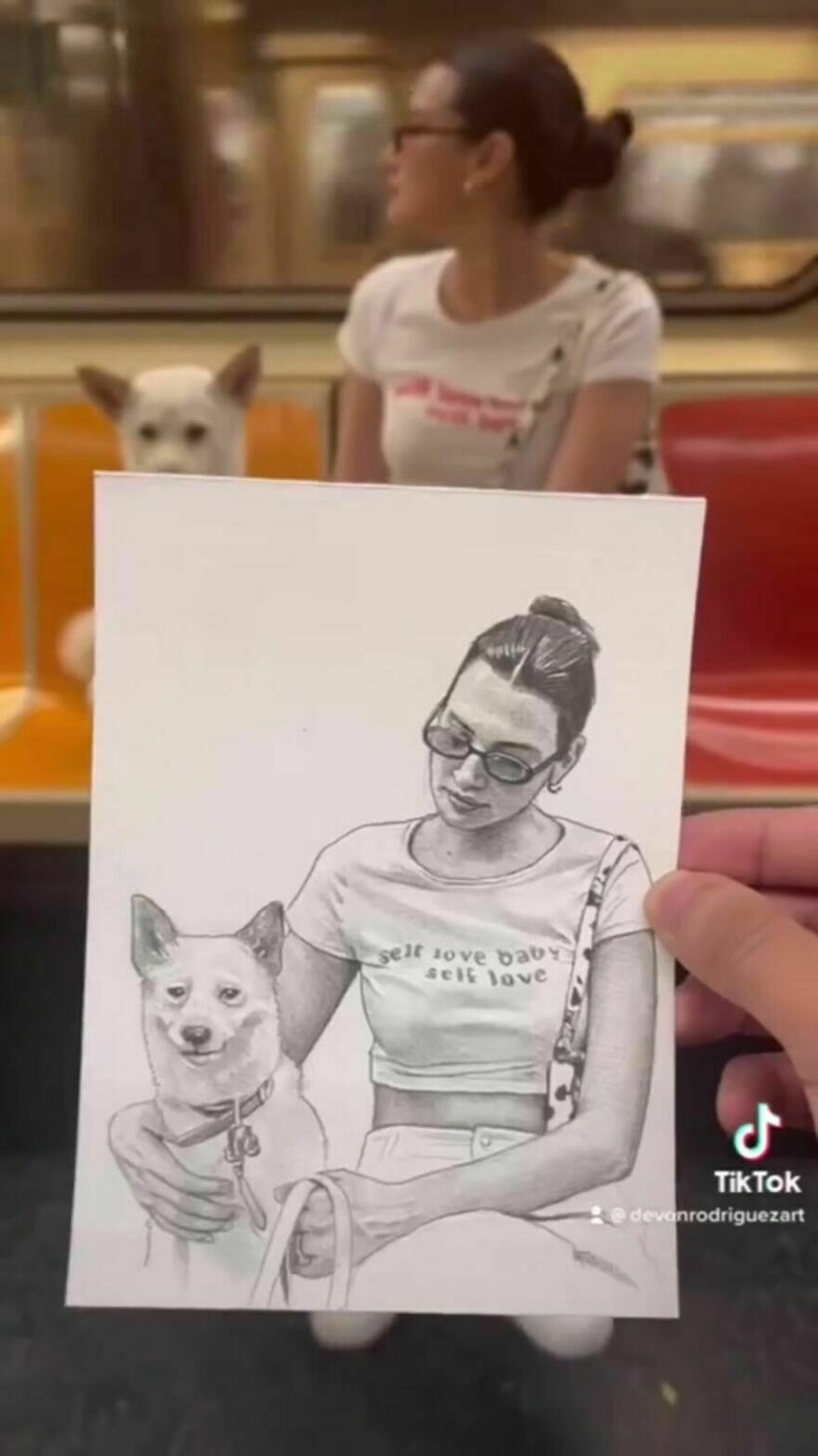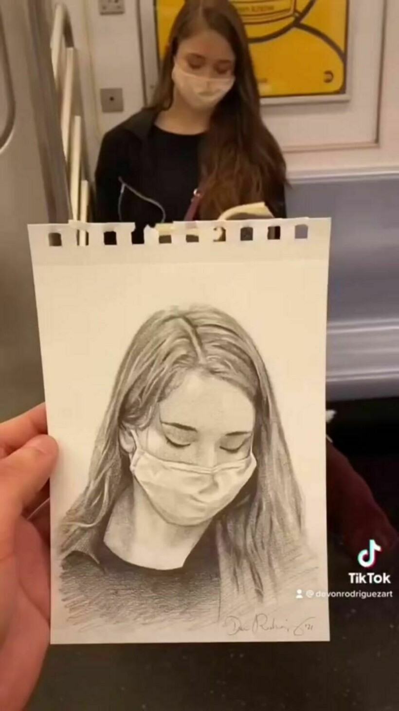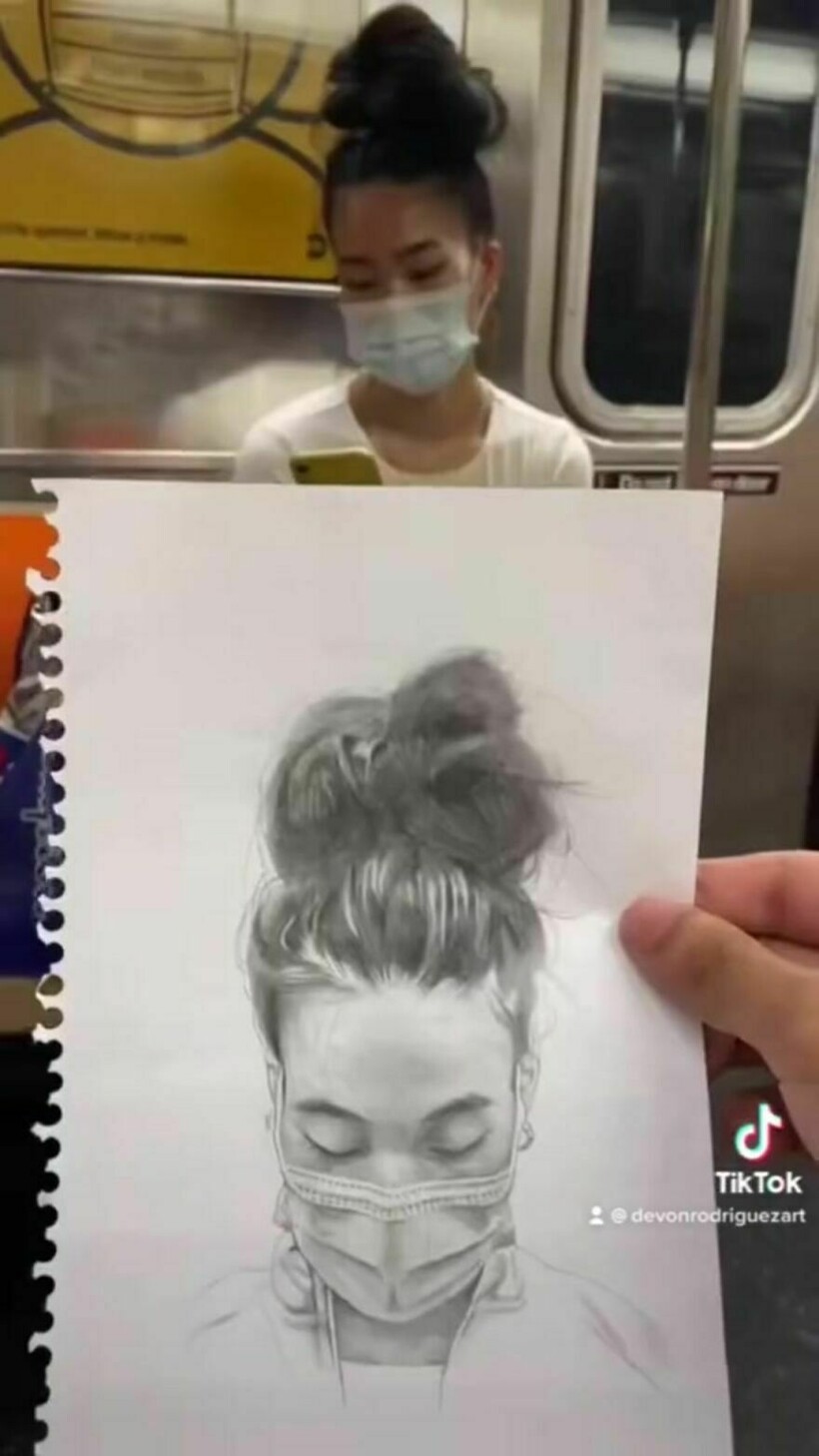 Метро — это часть жизни многих людей, особенно Девона Родригеза (Devon Rodriguez): он часто спускается в подземку, чтобы… порисовать! Девон живет в Нью-Йорке, и, садясь в поезд, он достает карандаши и бумагу, для того чтобы запечатлеть какого-нибудь пассажира. Удивительно, но ему удается это сделать за очень короткий промежуток времени, пока поезд находится в движении. Мы уже показывали вам старые фотографии, где видно, как выглядели пассажиры Нью-Йорка до эпохи смартфонов: их запечатлела в 1970-х годах Хелен Левитт. А теперь посмотрите на современных пассажиров, но не сфотографированных, а нарисованных художником. Некоторые рисунки поражают своей реалистичностью: портреты Девона потрясающи, особенно невероятно, что он делает их так быстро.