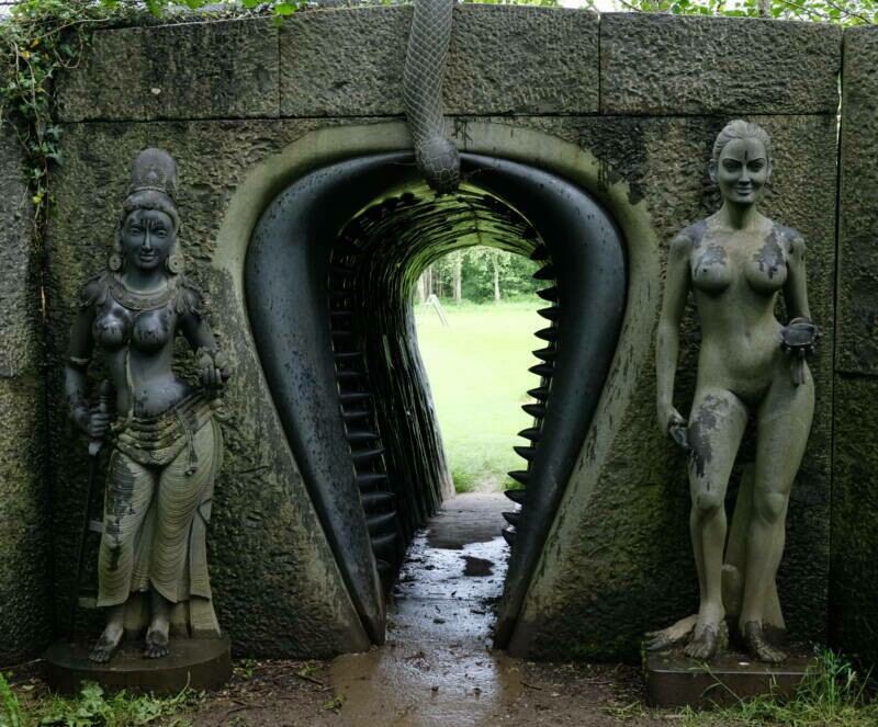 Так что же выступает в качестве духовной пищи в Victoria's Way? Жутковатые скульптуры, каждая из которых имеет свой смысл. Всего скульптур четырнадцать, и от некоторых мурашки по коже. Начинается все еще на входе в парк: он выглядит как зубатый туннель vagina dentata, который охраняют змеи. Удивляетесь такому внешнему виду?