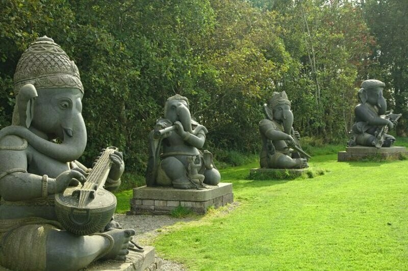 Ну а остальные статуи полны оптимизма: это Ганапати в совершенно разных позах. В индуизме этого бога изображали с головой слона, он символизирует мудрость и благополучие. Ганеша, как еще называют этого бога, один из главных в индуизме, в парке его девять воплощений: он играет на музыкальных инструментах, читает и выглядит так, будто познал дзен. Собственно, как и положено богу благополучия.