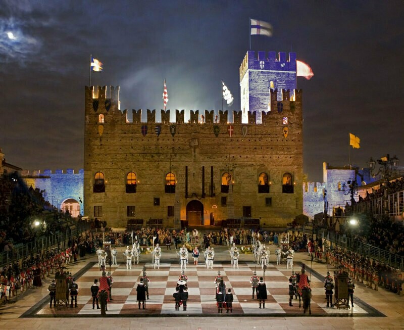 Помните, как Рон, Гарри и Гермиона стали героями шахматной партии в «Философском камне»? Оказывается, такое состязание уже несколько веков проходит в итальянской коммуне Маростика. Называется это мероприятие Partita A Scacchi. Люди наряжаются в шахматные фигуры и на площади, где выложена огромная шахматная доска, играют в шахматы самими собой. Баталии бывают очень эмоциональными и зрелищными.